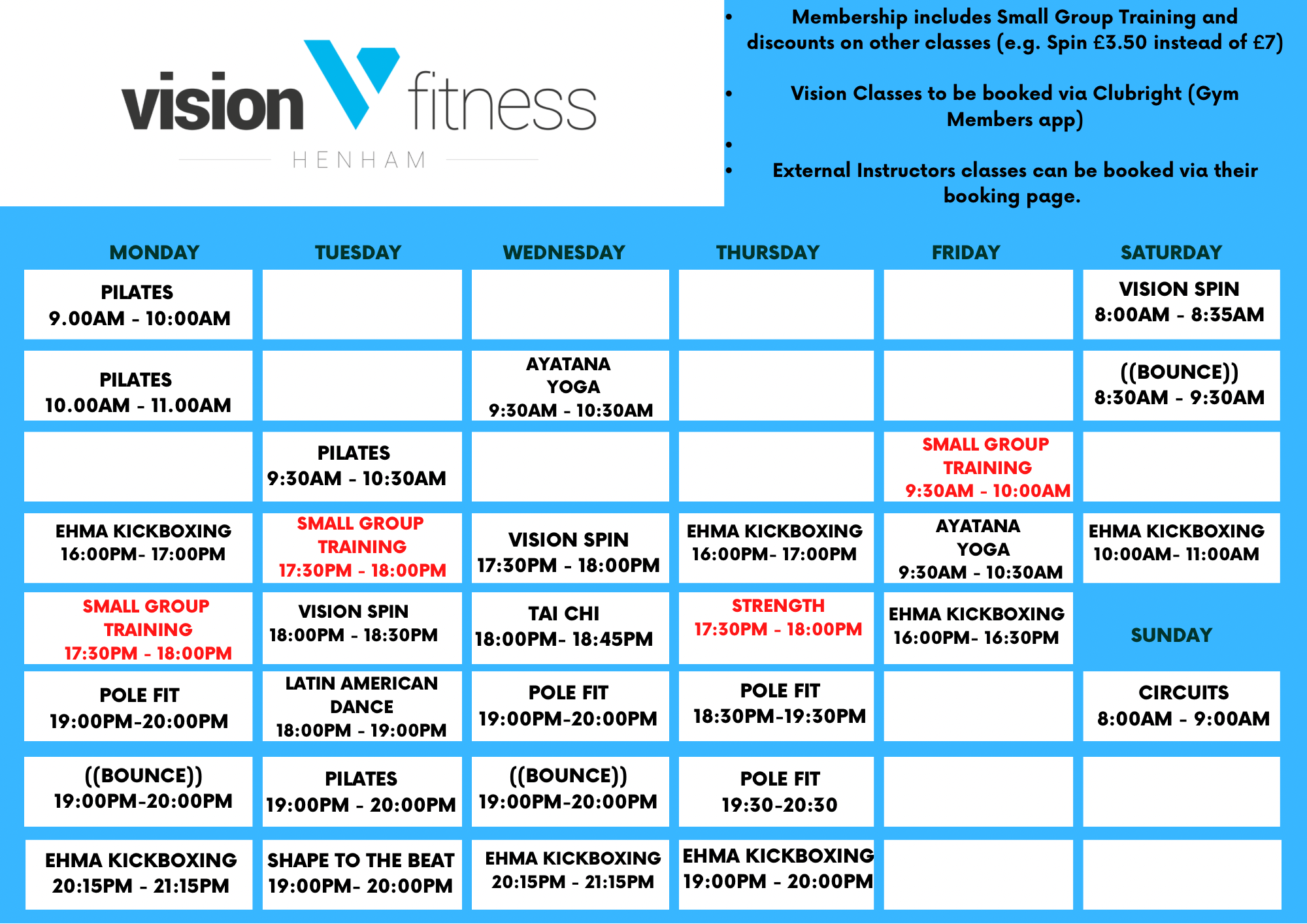 Please see below our current class timetable. Vision Classes can be booked via the members app. “Clubright”. For Pilates, Yoga, Pole Fitness and ((BOUNCE)) please click the buttons next to the Photo Timetable to go straight to their booking page. If you have any further questions on the classes simply email us info@visionfitnesshenham.co.uk